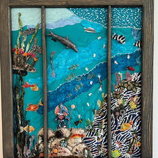 Fantasy is the essence of creativity. That is, to marvel at what exists in nature and fantasize what is unknown to oneself or to humanity, is to think creatively. As a landscape artist, my work is frequently grounded in this fantastical mindscape, especially my ocean-themed triptych presented here, “Nammu, Goddess of the Primeval Seas”. The oceans are the last unknown frontier and are filled with a plethora of fantastical creatures - those we have discovered and, most excitingly, those yet to be discovered. For example, over 2000 different species of nudibranches are known and they are all incredibly distinct, beautiful, and other-worldly; almost everyday new species of nudibranches are discovered. It makes me ponder that if it can be imagined, maybe it exists. So, I created a few nudibranches from fabric and beads, but several other creatures in this piece are purely from fantasizing about what else might exist in the vast unexplored ocean depths. Antique white lace and crystal beads.